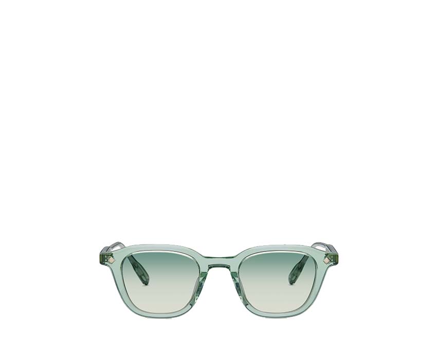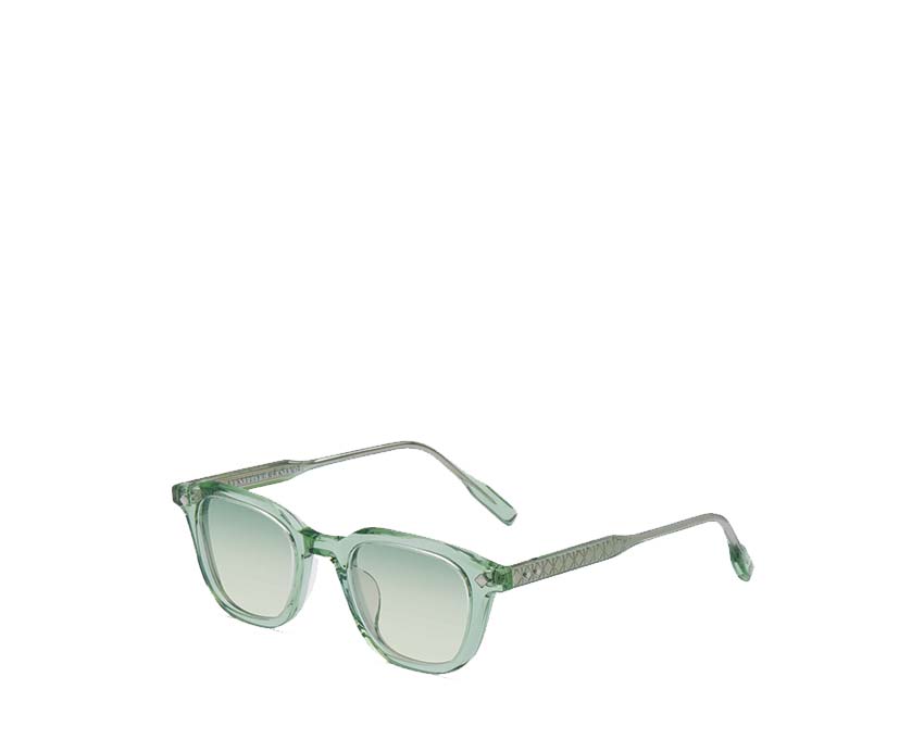 Fabriqué à la main au Japon Acétate japonais de haute qualité en cristal émeraude Quincaillerie plaquée palladium Branches d'inspiration vintage avec grip antidérapant Charnières rivetées personnalisées à 5 barillets avec détails fins Noyau métallique au design gravé signature. Marques de beauté gravées signature Verres solaires Base 2 CR39 Dégradés Bleu-Vert Traitement antireflet au dos Protection 100% UV